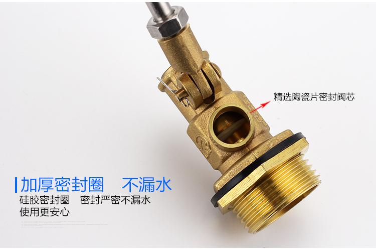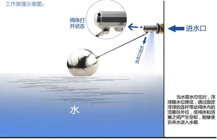 當水塔內(nèi)水面下降時,浮球下落,利用水管內(nèi)水的壓力,將閥體里的密封硅膠柱塞打開,閥體開啟供水,當水塔水位上升時,浮球上浮,連桿帶動柱塞,硅膠體密封進水孔,閥體停止供水.