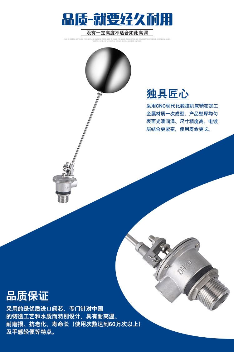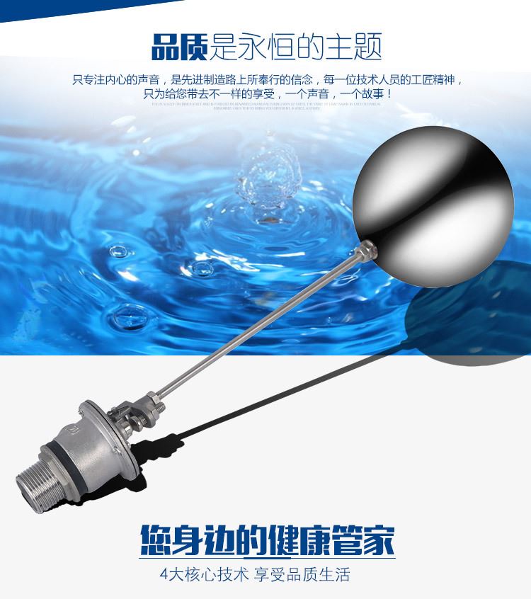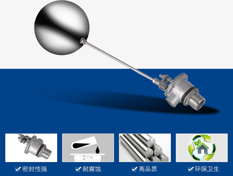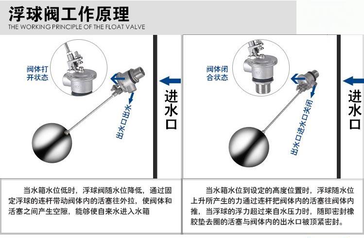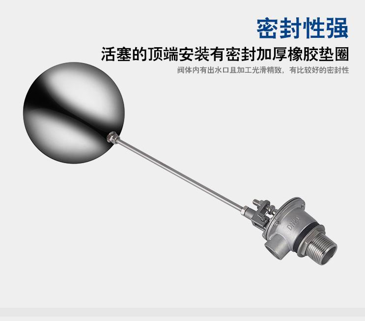 當(dāng)水塔內(nèi)水面下降時(shí),浮球下落,利用水管內(nèi)水的壓力,將閥體里的密封硅膠柱塞打開(kāi),閥體開(kāi)啟供水,當(dāng)水塔水位上升時(shí),浮球上浮,連桿帶動(dòng)柱塞,硅膠體密封進(jìn)水孔,閥體停止供水.