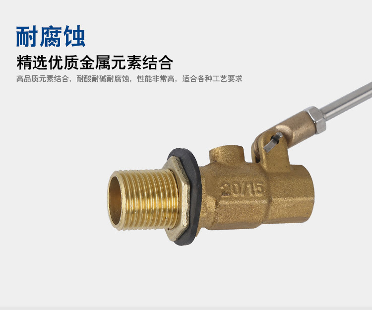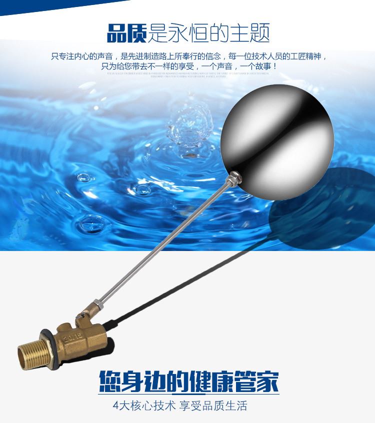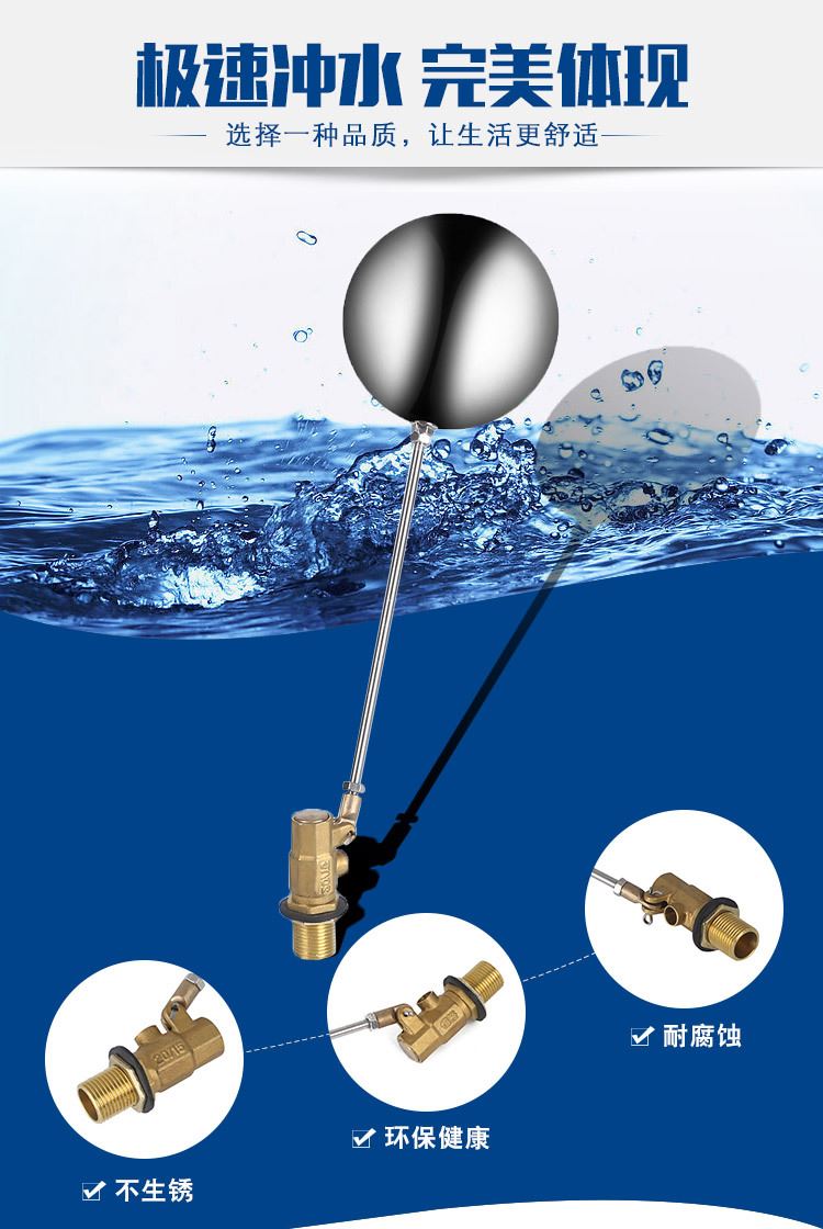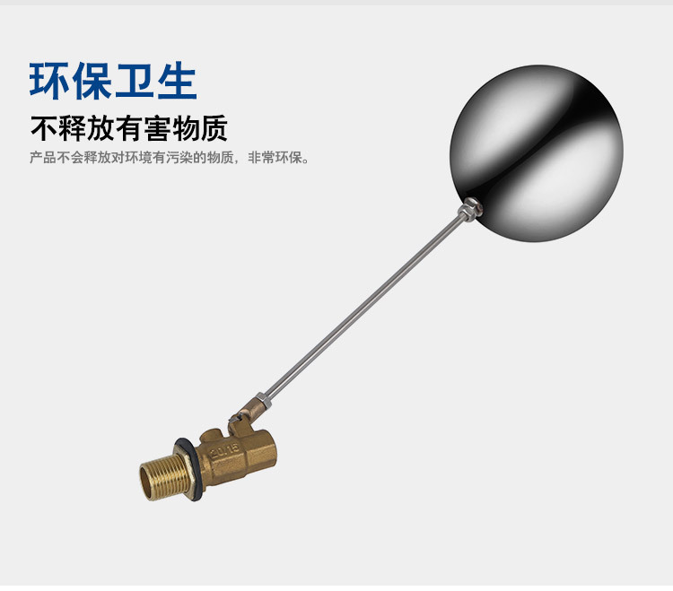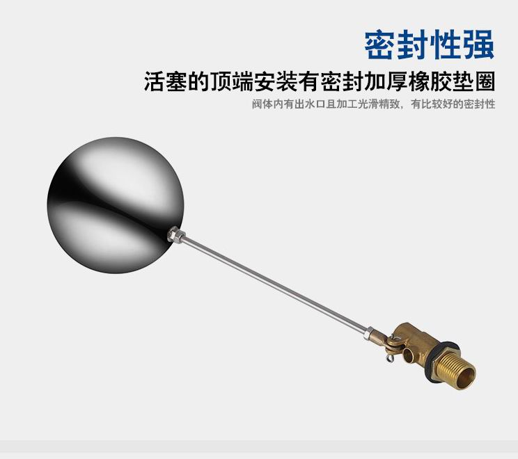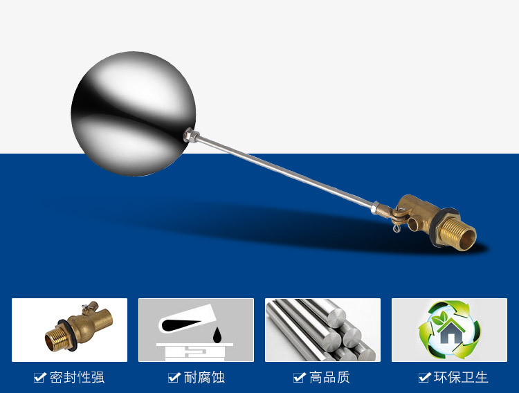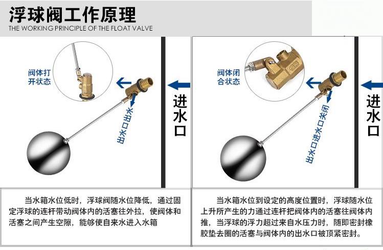 當(dāng)水塔內(nèi)水面下降時(shí),浮球下落,利用水管內(nèi)水的壓力,將閥體里的密封硅膠柱塞打開,閥體開啟供水,當(dāng)水塔水位上升時(shí),浮球上浮,連桿帶動(dòng)柱塞,硅膠體密封進(jìn)水孔,閥體停止供水.