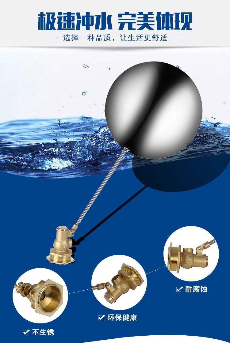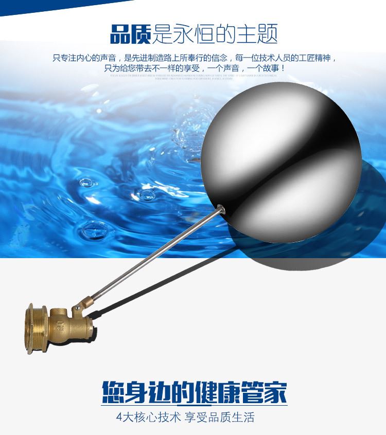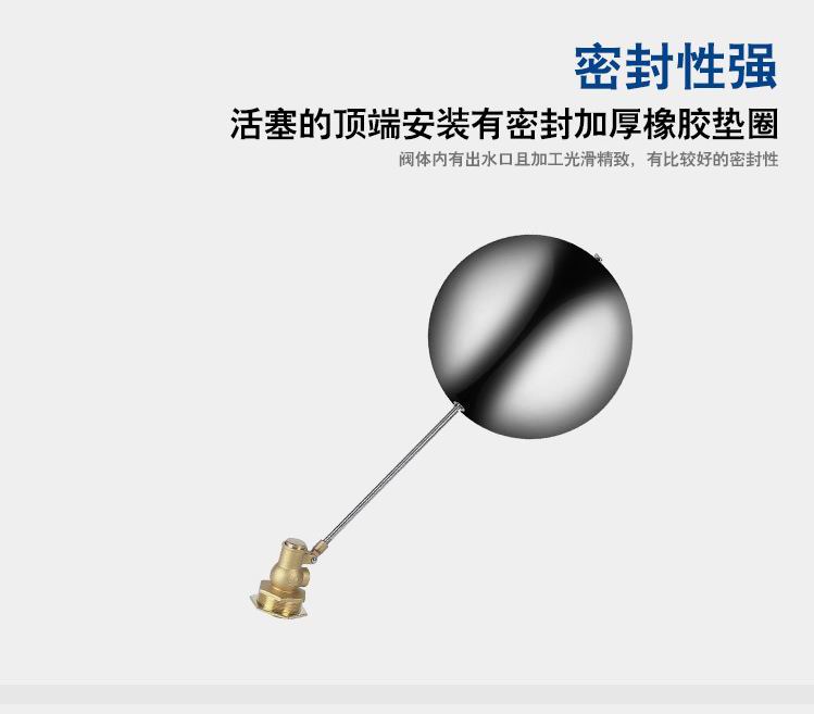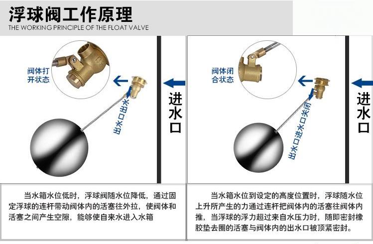 當(dāng)水塔內(nèi)水面下降時(shí),浮球下落,利用水管內(nèi)水的壓力,將閥體里的密封硅膠柱塞打開,閥體開啟供水,當(dāng)水塔水位上升時(shí),浮球上浮,連桿帶動(dòng)柱塞,硅膠體密封進(jìn)水孔,閥體停止供水.