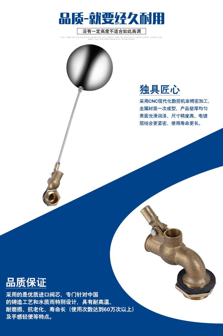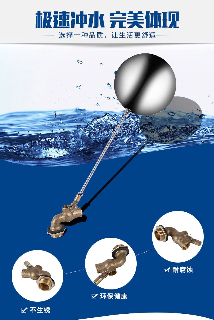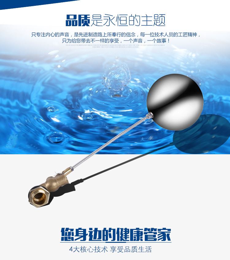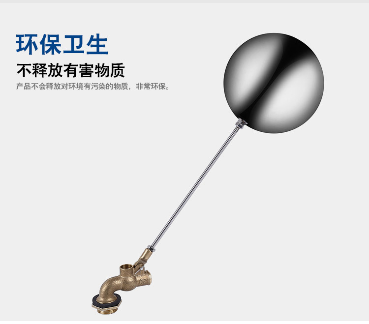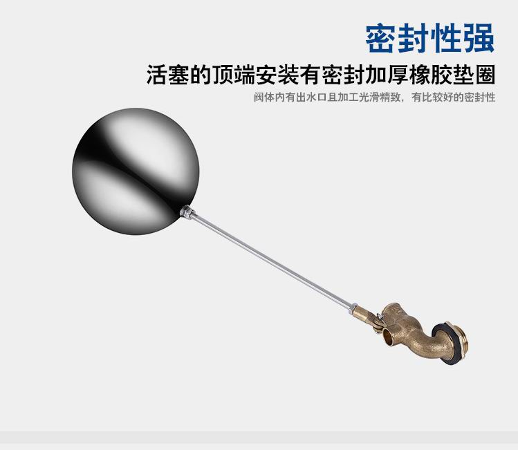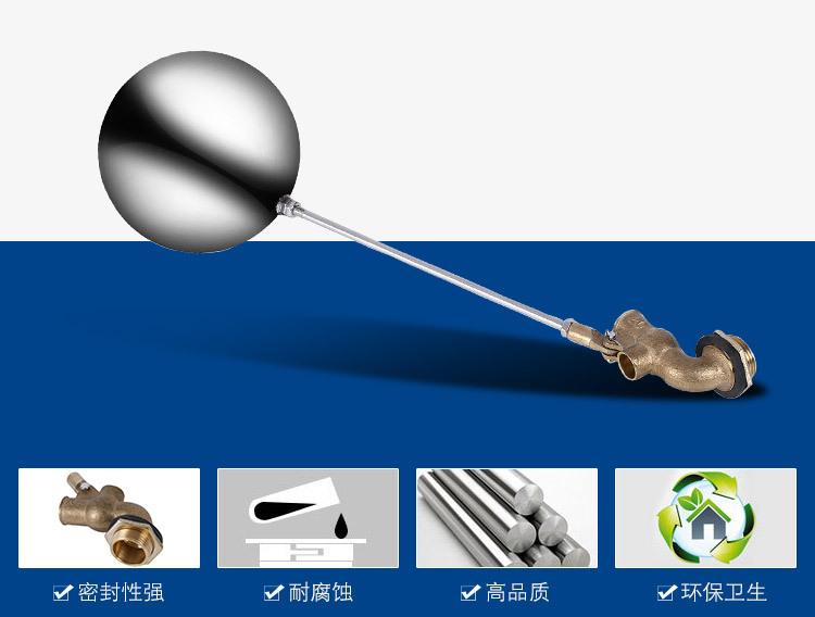 當(dāng)水塔內(nèi)水面下降時(shí),浮球下落,利用水管內(nèi)水的壓力,將閥體里的密封硅膠柱塞打開(kāi),閥體開(kāi)啟供水,當(dāng)水塔水位上升時(shí),浮球上浮,連桿帶動(dòng)柱塞,硅膠體密封進(jìn)水孔,閥體停止供水.
